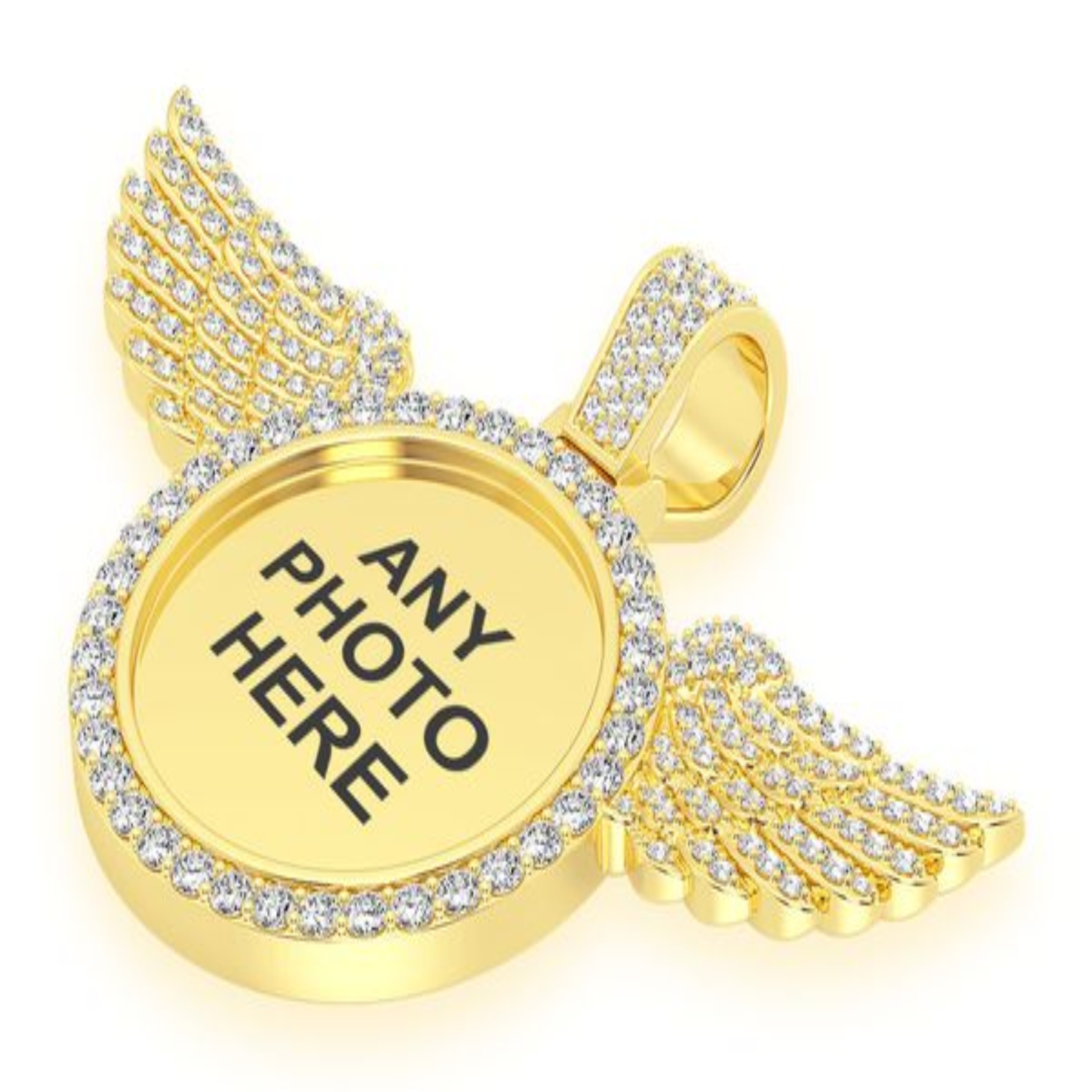 • Keep your memories close with this custom picture pendant framed in wings and iced in 6.33 Ct. of diamonds.